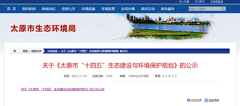 近日,太原市生態(tài)環(huán)境局在其官網(wǎng)發(fā)布了關(guān)于《太原市“十四五”生態(tài)建設(shè)與環(huán)境保護規(guī)劃》(下文簡稱《規(guī)劃》)的公示。