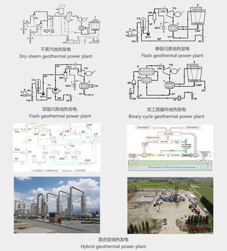 地熱發(fā)電需根據地熱流體的溫度、壓力以及它們的水、汽品質的不同而采取不同的設計方案。其主要類型包括:干蒸汽地熱發(fā)電、單級閃蒸地熱發(fā)電、雙級閃蒸地熱發(fā)電、一井一站地熱發(fā)電、混合型地熱發(fā)電、雙工質循環(huán)地熱發(fā)電、干熱巖發(fā)電。