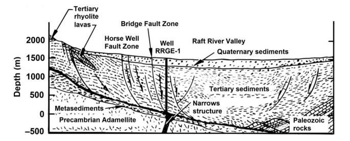 拉夫特河地?zé)崽?/a>的熱儲層,處在一個盆地中,這個盆地西部以一個小角度的斷層為界限,東邊則是由黑松山(Black Pine Mountains)和一個二次斷層分界。熱儲的蓋層為第三系的沉積層,基底巖石大約厚度為1600m,在這個深度被一個東北向的線性構(gòu)造—解理構(gòu)造(Narrows Structure)所貫穿,人們認為這個結(jié)構(gòu)是基底剪切作用產(chǎn)生的。熱源為前寒武紀(jì)二長花崗巖。開始,人們認為熱液是通解理構(gòu)造涌上來,然后通過其他的褶皺和斷層蔓延整個沉積構(gòu)造?,F(xiàn)在的人們則認為有兩個熱源補給區(qū),一個來自西北方向沿著馬井?dāng)鄬臃植嫉难a給區(qū),另外一個則是來自東南方向的,可能是與變窄構(gòu)造有關(guān)聯(lián)。