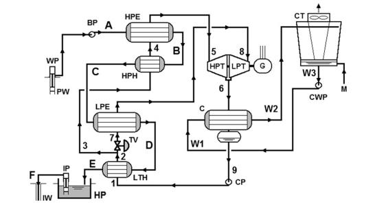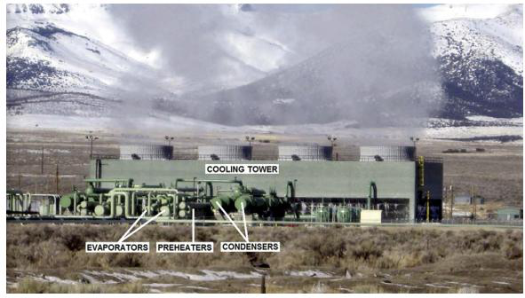 最新的USGeo拉夫特河發(fā)電站坐落在起初的電站南南東方向約600m的地方。這個最新的發(fā)電機組的能量對流系統(tǒng)是一個部分回?zé)?,二級,雙壓力雙循環(huán)發(fā)電機組。有兩個單獨的單元,每一個單元都有兩個軸向流動的渦輪來驅(qū)動同一個中心發(fā)電機。一個四室的水冷卻塔為殼管冷凝器(shell-and-tube condensers)提供冷卻提供冷卻水。補充水是從水井中獲取的,而且需要及時處理來維持冷卻塔中的水的質(zhì)量。138℃的鹵水以大約3.15×106kg/s的速度泵向蒸發(fā)器和預(yù)熱器,循環(huán)工質(zhì)異戊烷(i-C5H12)就是在蒸發(fā)器和預(yù)熱器中吸收溫度的。換熱器只在高壓循環(huán)中才使用。