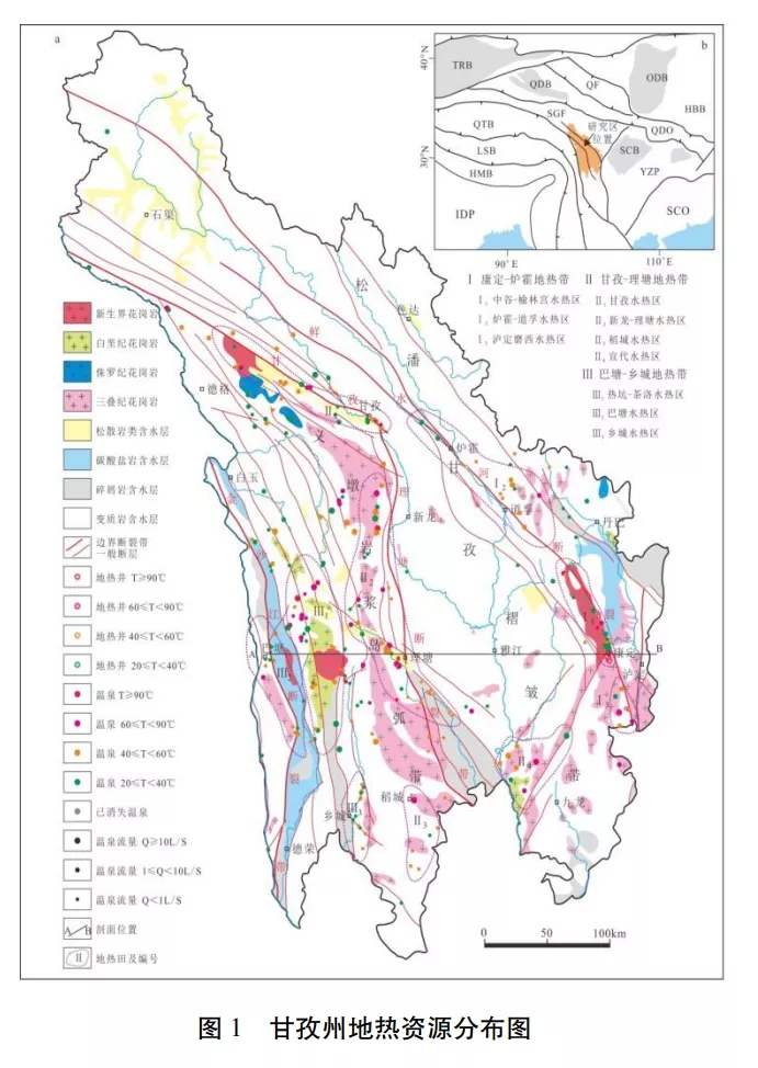 據(jù)最新調查成果,甘孜州的水熱活動強烈,全州共有溫泉點264 個,地熱井17 口, 除色達縣外,其余17 縣均有水熱活動。 全州溫泉分布主要受 3 條深大斷裂帶和數(shù)條主要大斷裂(德格-鄉(xiāng)城大斷裂帶、玉科大斷裂帶、 陳支大斷裂帶等)控制,形成了3個主要地熱帶和9個水熱活動集中分布區(qū)的基本分布格局。水熱活動強烈區(qū)一般位于主干斷裂帶及其轉 折的部位,以康定縣、甘孜縣、理塘縣、巴塘縣 為典型代表。